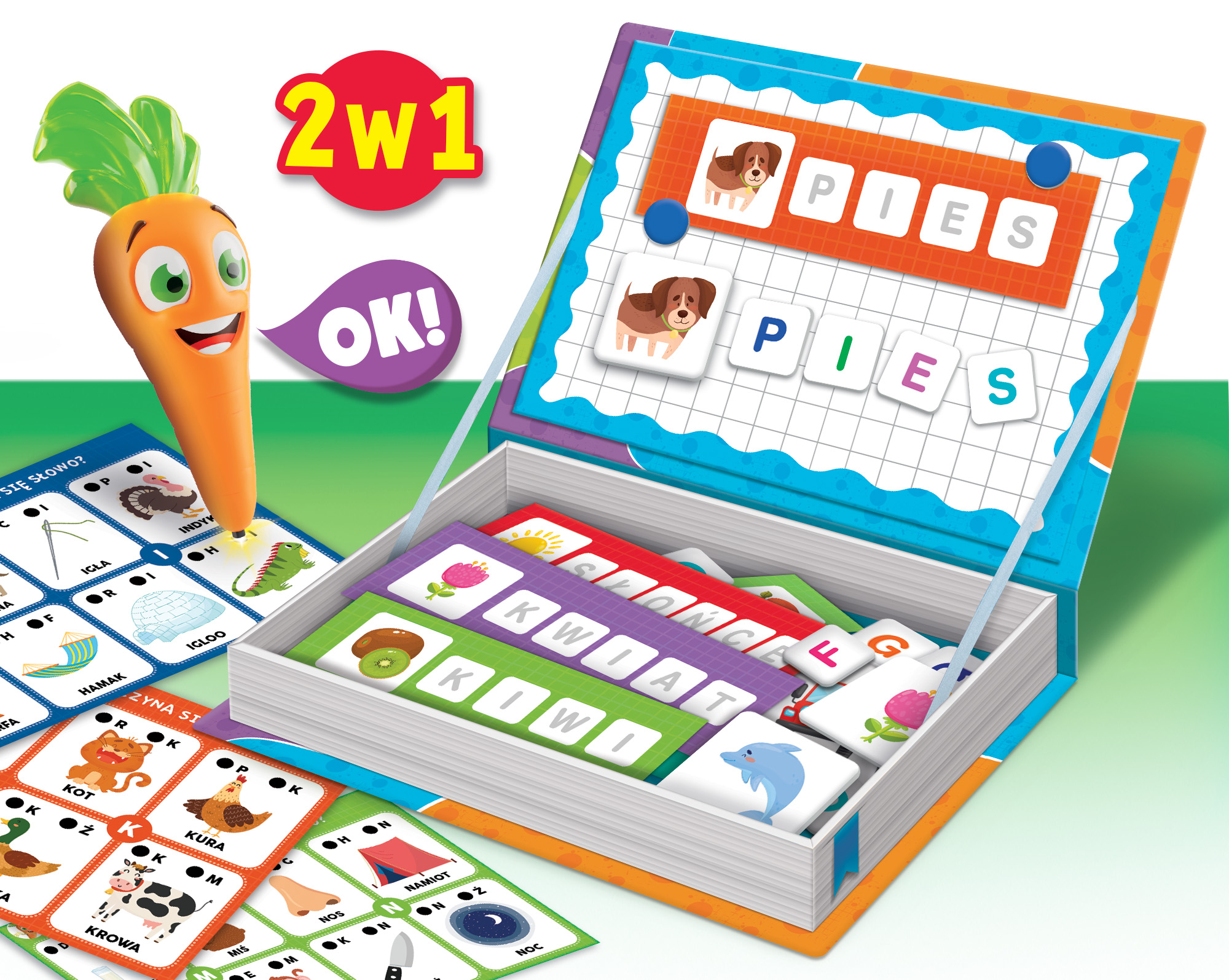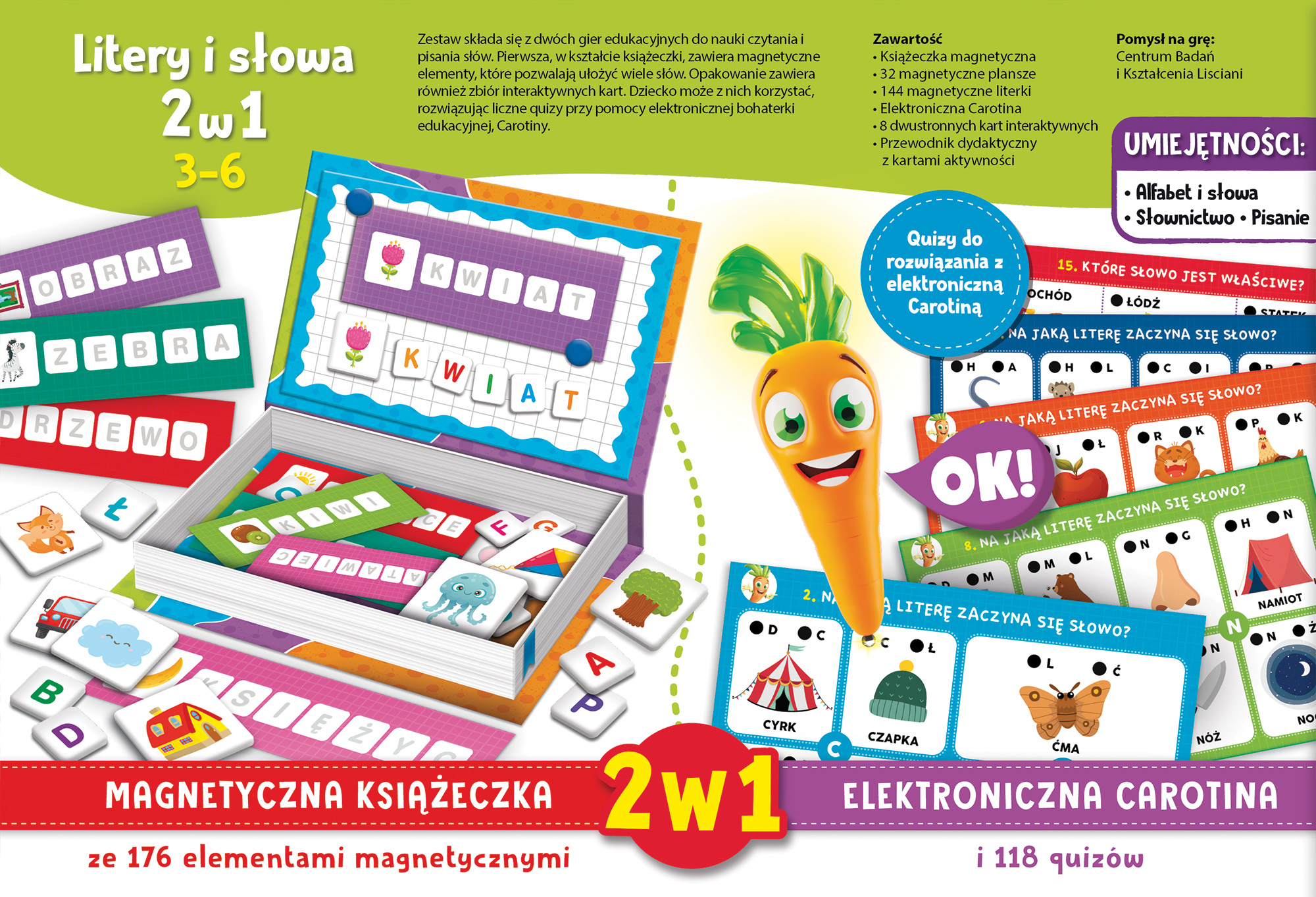 Wyjątkowe połączenie dwóch wspaniałych klasyków edukacyjnych! Pudełko z magnetycznym zestawem do gry i elektroniczną Carotiną. Wiele aktywności pomagających odkrywać litery oraz słowa!