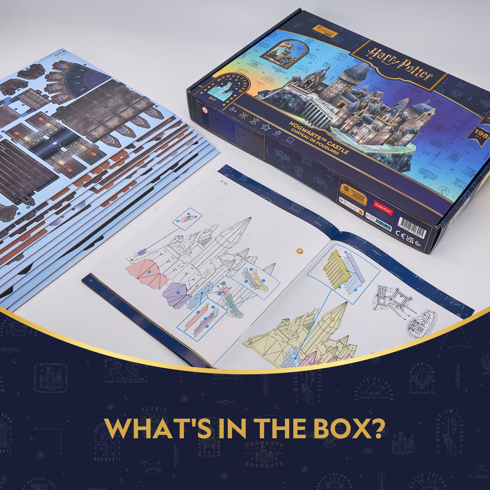 Trójwymiarowe puzzle Cubic Fun nieprzeznaczone dla mugoli! Przenieś się prosto do magicznego świata czarodziejów i Szkoły Magii i Czarodziejstwa, składając te niezwykłe puzzle! Opakowanie zawiera 198 puzzli z pianki, przygotowanych na specjalnych sztancach. Podczas składania nie są potrzebne dodatkowe narzędzia - nożyczki czy klej. Zestaw to 198 puzzli, które po złożeniu pozwalają podziwiać niezwykły Hogwart o wielkości 32,5x45,5x32,5 cm.