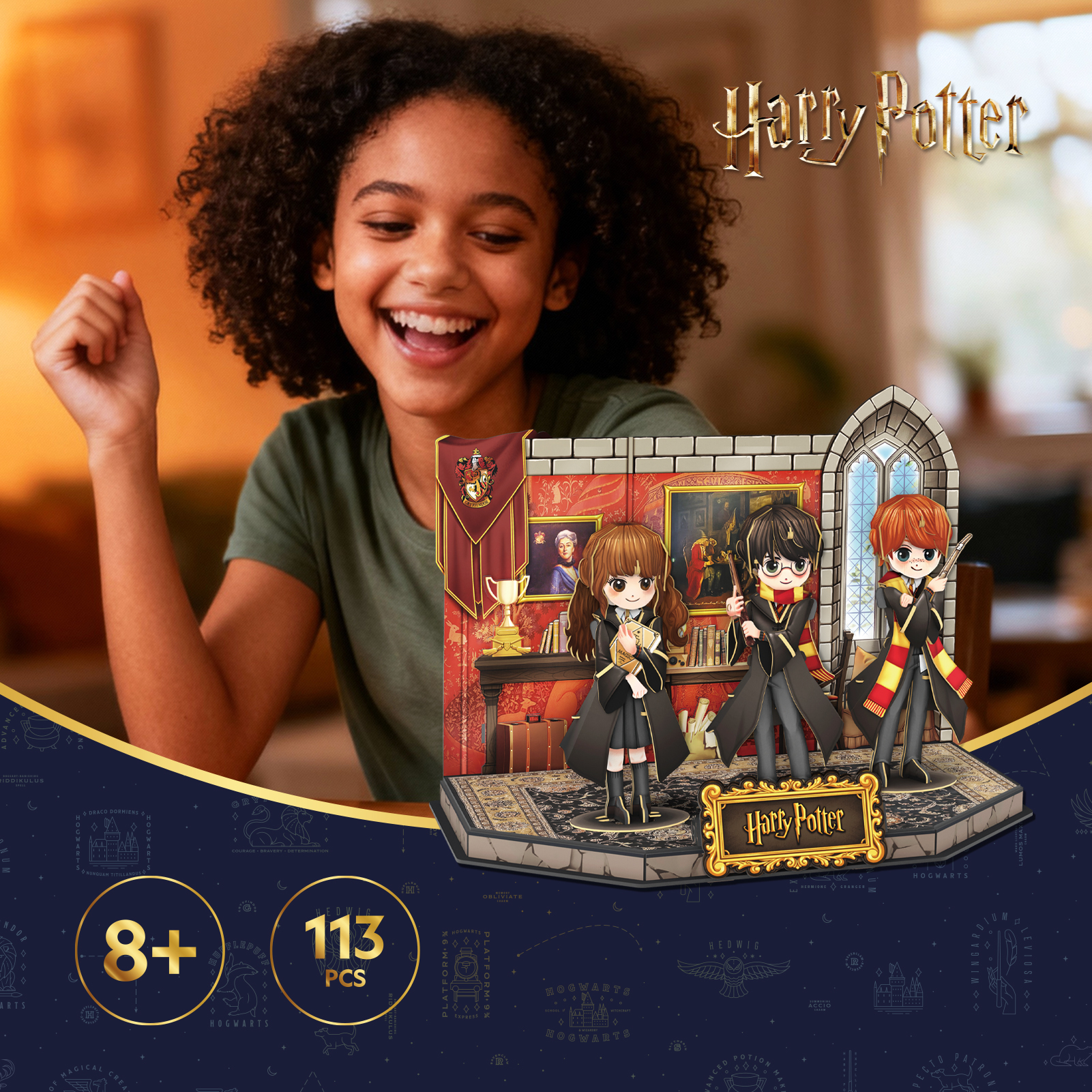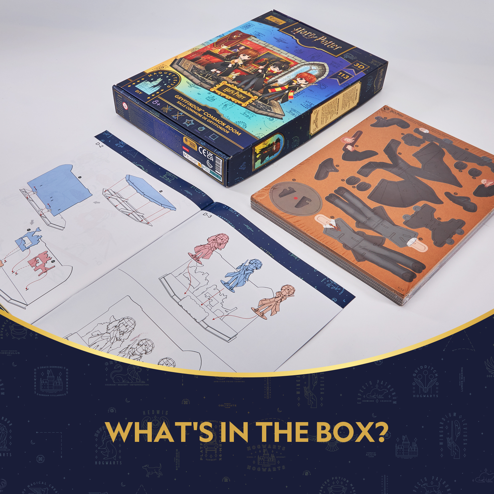 Trójwymiarowe puzzle Cubic Fun nieprzeznaczone dla mugoli! Przenieś się prosto do magicznego świata czarodziejów i Szkoły Magii i Czarodziejstwa, składając te niezwykłe puzzle! Opakowanie zawiera 113 puzzli z pianki, przygotowanych na specjalnych sztancach. Podczas składania nie są potrzebne dodatkowe narzędzia - nożyczki czy klej. Zestaw to 113 puzzli, które po złożeniu pozwalają podziwiać pokój wspólny Gryffindoru i złote trio - Harry'ego, Rona oraz Hermionę o wielkości 30,3x19,5x21,6 cm.