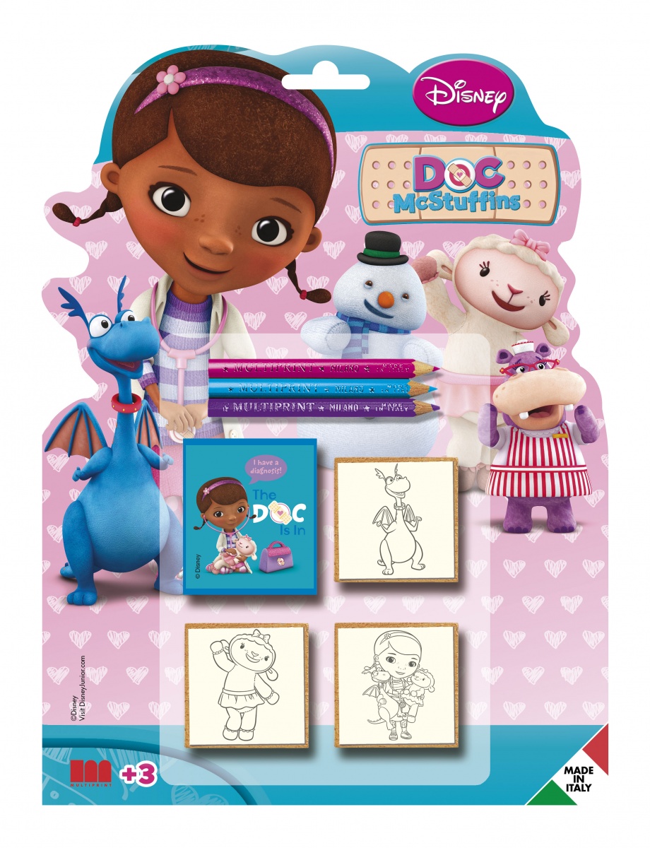 Zestaw pieczątek Shaped na blistrze Doc Mcstuffins: 3 pieczątki wykonane z drewna i kauczukowej gumy, pudełko z tuszem oraz kredki do kolorowania.