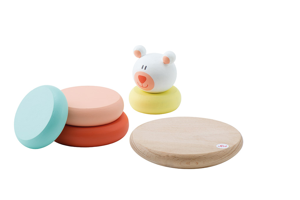 Klocki progresywne z uroczym misiem, składające się z 4 pastelowych obręczy o różnej średnicy, co ułatwia ułożenie poprawnej konstrukcji.