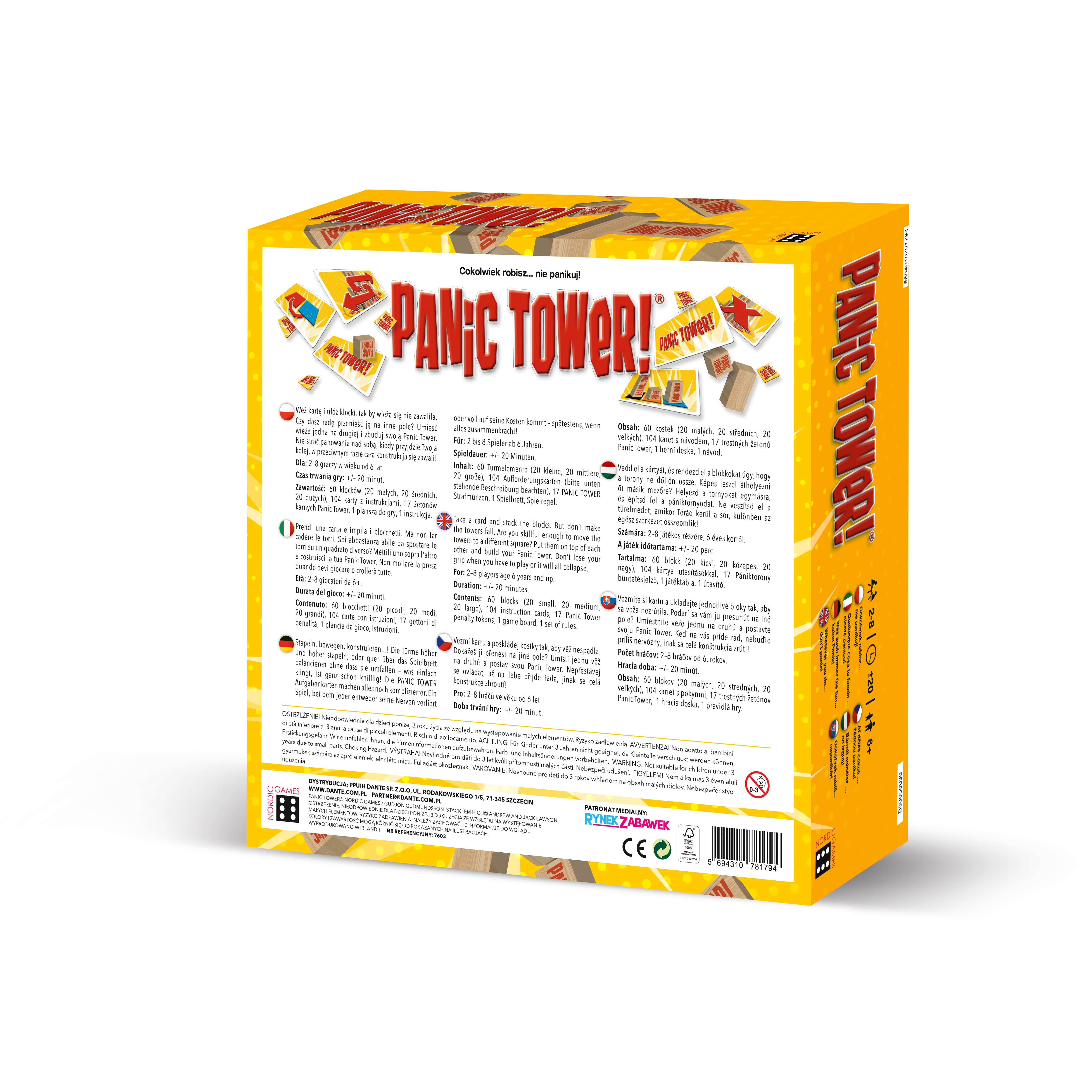 Sukcesem gry Panic Tower jest jej prostota. Gracze układają wieżę z drewnianych klocków na załączonej do zestawu planszy. Uczestnicy gry wykonują polecania z kart. Budują wieżę, stawiając klocki w pozycji pionowej. Celem gry jest wykonanie wylosowanego zadania i nieprzewrócenie wieży. To świetna zabawa zręcznościowa dla dużych i małych - idealny pomysł na wspólne spędzanie czasu.