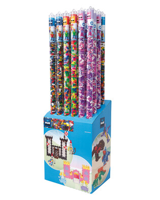 Display Plus-Plus z metrowymi tubami, który świetnie nadaje się do ekspozycji w sklepie. Zawiera 24 tuby z elementami w kolorach podstawowych, 8 neonowych oraz 4 pastelowe. Każda z tub zawiera 520 elementów.