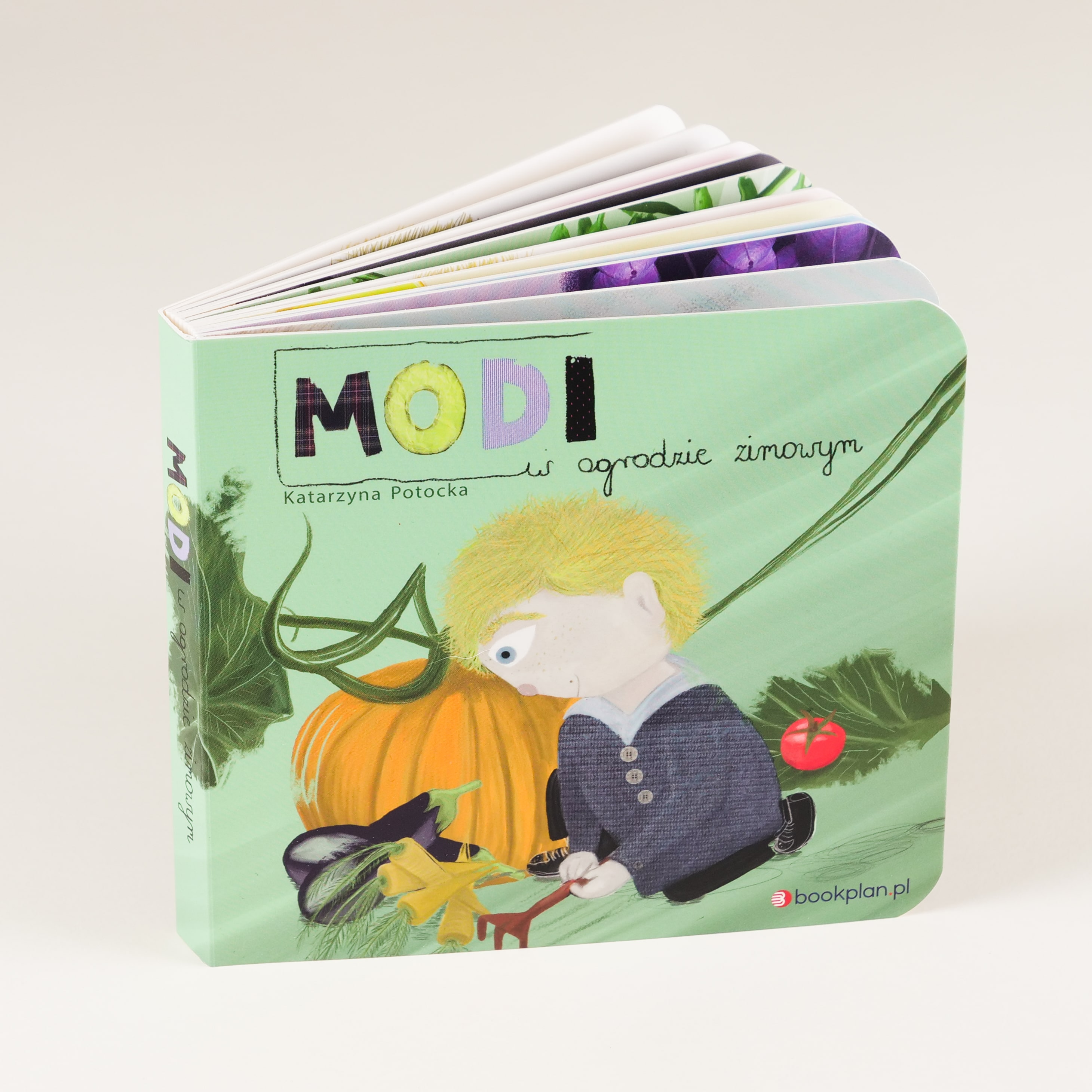 MODI to książeczka o chłopcu i jego piesku Franiu, którzy wyruszają w podróż, żeby odkrywać świat. Modi i Franio odwiedzają Babcię w ogrodzie. Razem będą odkrywać kolory, nazwy warzyw oraz owoców! Modi odkryje, że dynia jest wielka i jest koloru pomarańczowego. Co znajdzie Franio i jakiego to będzie koloru?