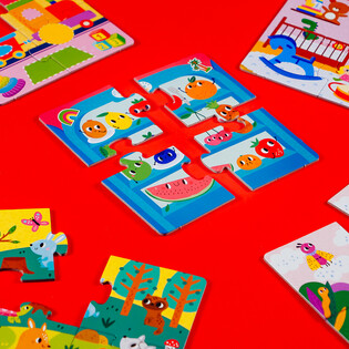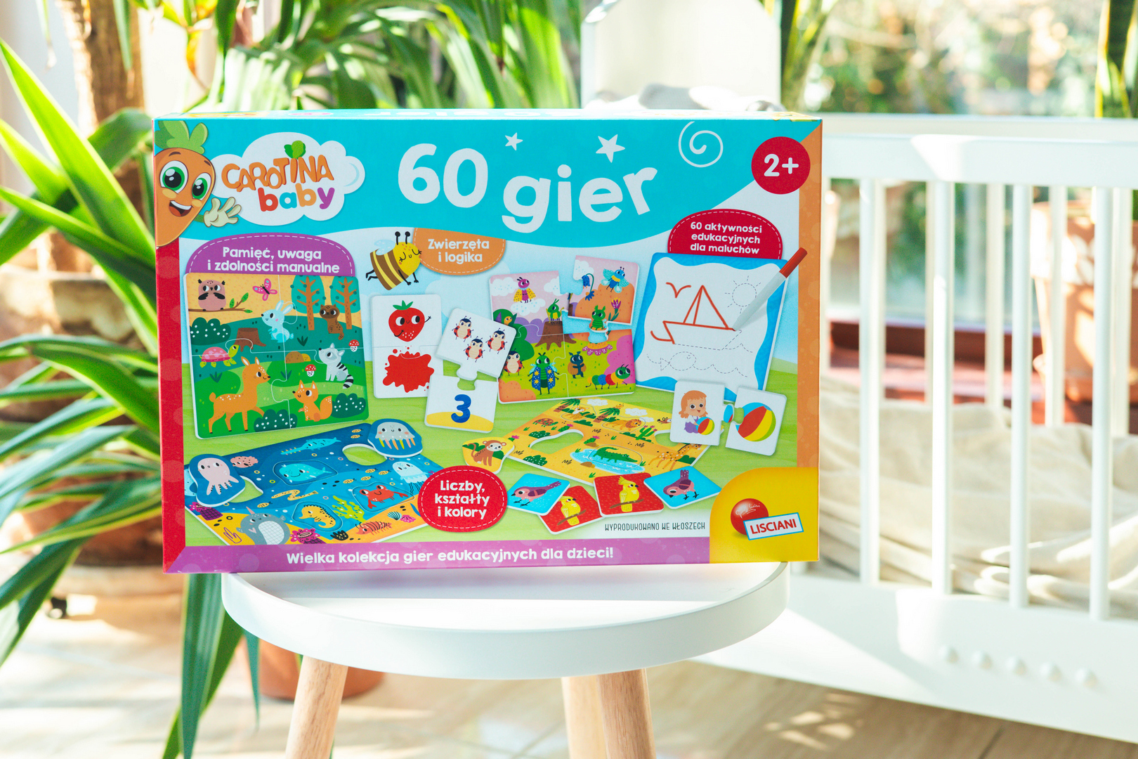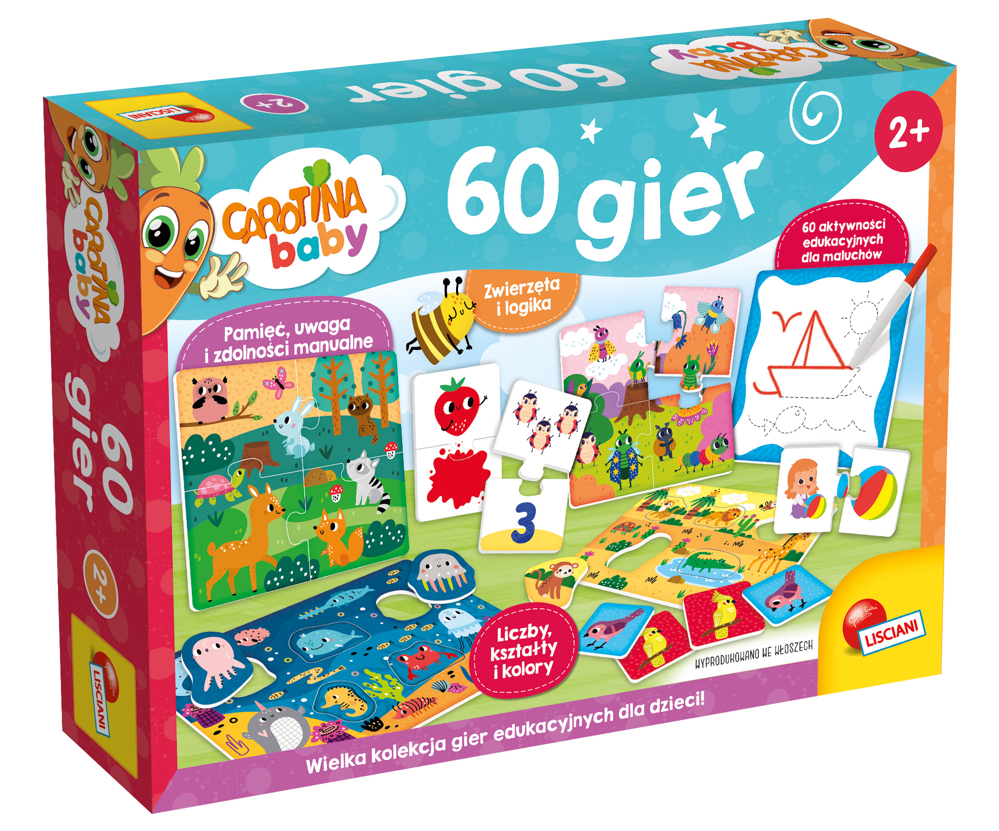 60 gier od Lisciani to wyjątkowa kolekcja gier edukacyjnych dla najmłodszych pozwalająca rozwinąć podstawowe kompetencje dziecka, takie jak dopasowywanie kształtów, umiejętność kojarzenia czy rysowanie pierwszych kształtów. Elementy dydaktyczne zestawu pozwalają na wykonywanie 60 różnych aktywności, w czym pomagają plansze ze środowiskami, gra pamięciowa, puzzle czy dwustronne tablice. Dzięki suchościeralnemu pisakowi dziecko może korzystać z gier dowolną ilość razy, po każdej próbie ścierając pozostałości pisaka z elementów specjalną gąbeczką. Dzięki zestawowi dziecko pozna zagadnienia związane z domem, lasem, morzem, farmą i sawanną co znacznie rozwinie jego znajomość zwierząt, owoców, warzyw czy przedmiotów codziennego użytku. Elementy zestawu są wykonane z trwałej tektury, a kształt i rozmiary elementów są dostosowane do dziecięcych rączek, dzięki czemu zabawa jest wygodna i łatwa.