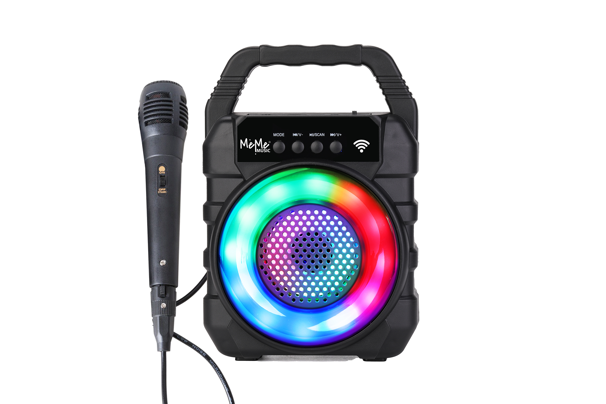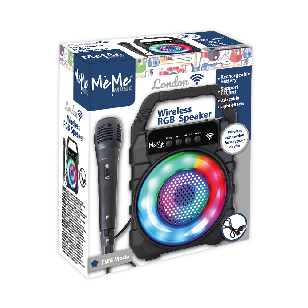 Bezprzewodowy wzmacniacz z efektami świetlnymi LED oraz mikrofonem. Wzmacniacz posiada gniazdo ładowania, karty TF, USB oraz mikrofonu. Możliwość odtwarzania radia. Przycisk odtwarzania i pauzy. Wybór następnego/poprzedniego utworu. Regulacja głośności. Możliwość połączenia dwóch wzmacniaczy.