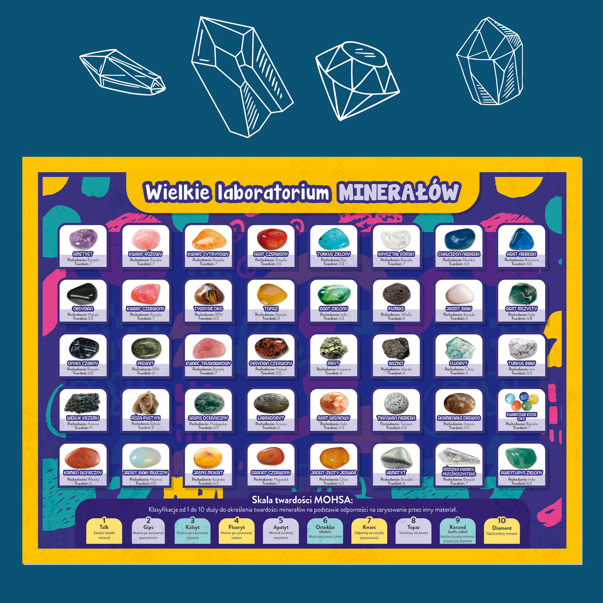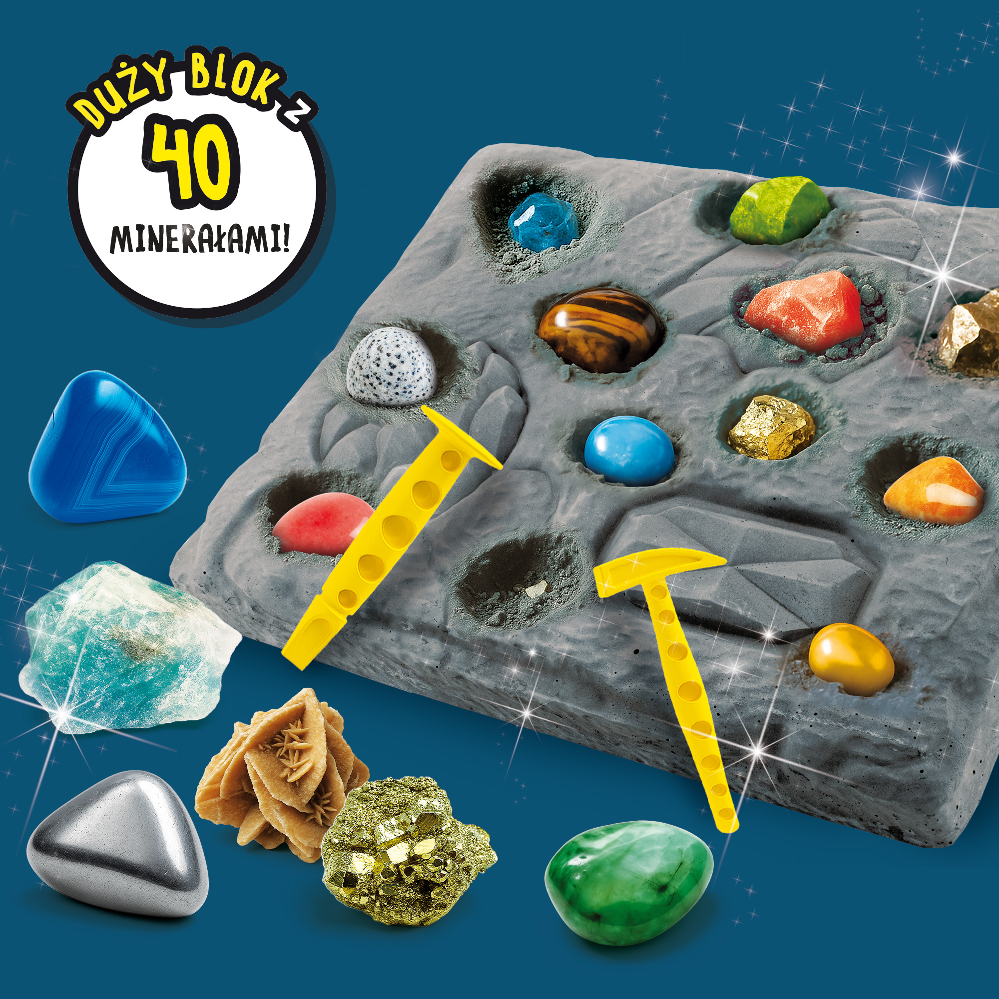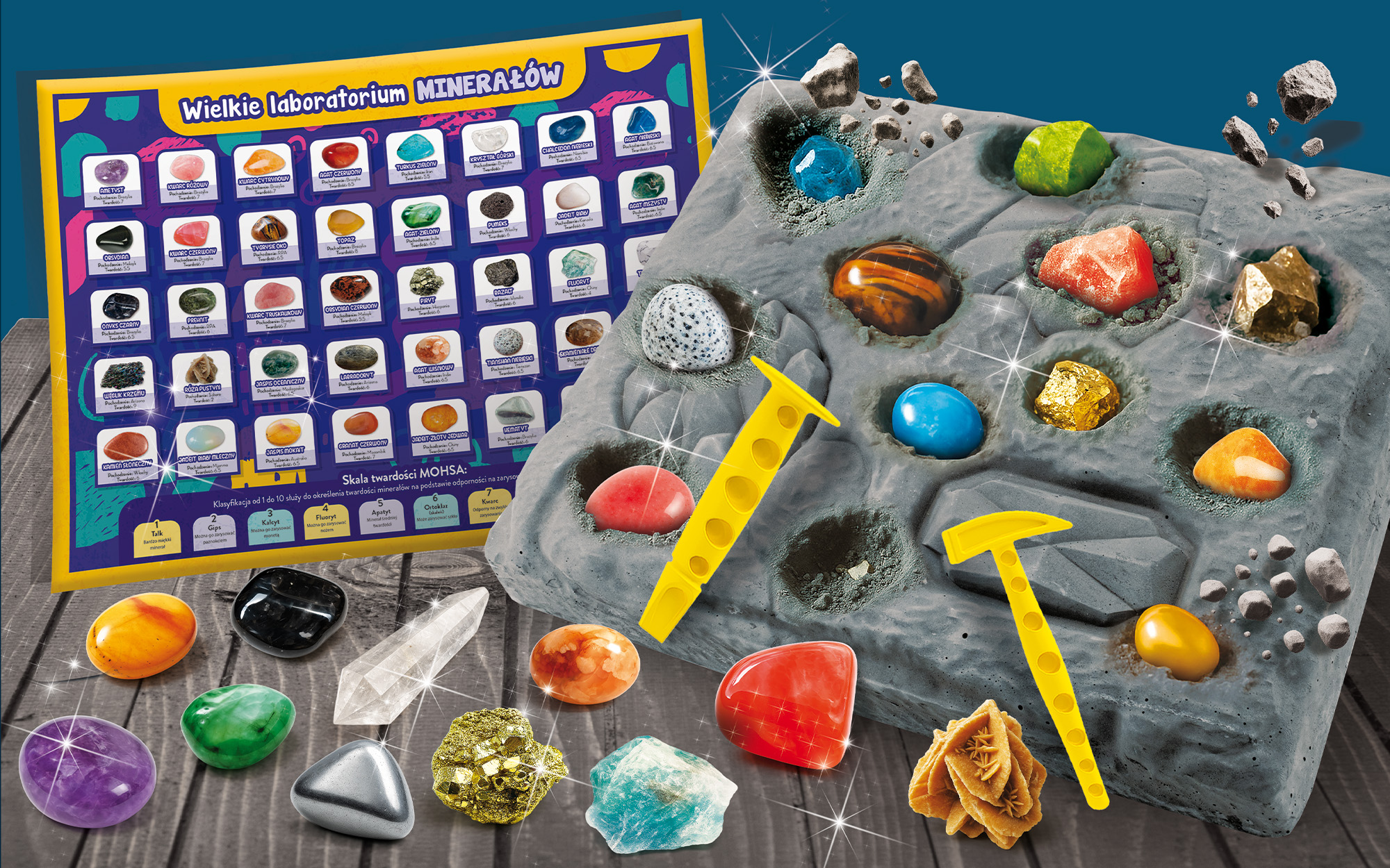 Laboratorium minerałów z serii I’m a genius, które pozwala odkryć fascynujący świat minerałów! W opakowaniu znajduje się duży blok kredowy, który, dzięki dołączonym narzędziom umożliwia odkrycie nawet 40 wyjątkowych kamieni. Zestaw zawiera również ilustrowany plakat pełen ciekawostek.