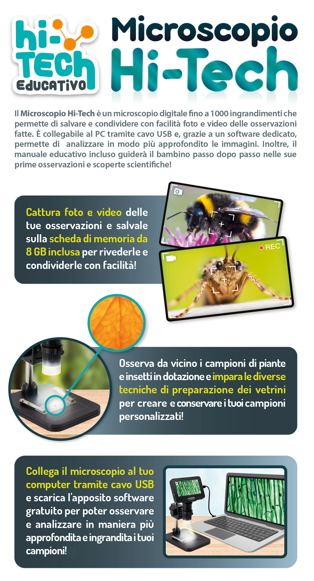 Mikroskop Hi-Tech to cyfrowy mikroskop z 1000-krotnym powiększeniem, który pozwala z łatwością zapisywać i udostępniać zdjęcia oraz filmy z przeprowadzonych obserwacji. Mikroskop można podłączyć do komputera za pomocą kabla USB, a dedykowane oprogramowanie umożliwia szczegółową analizę obrazów.