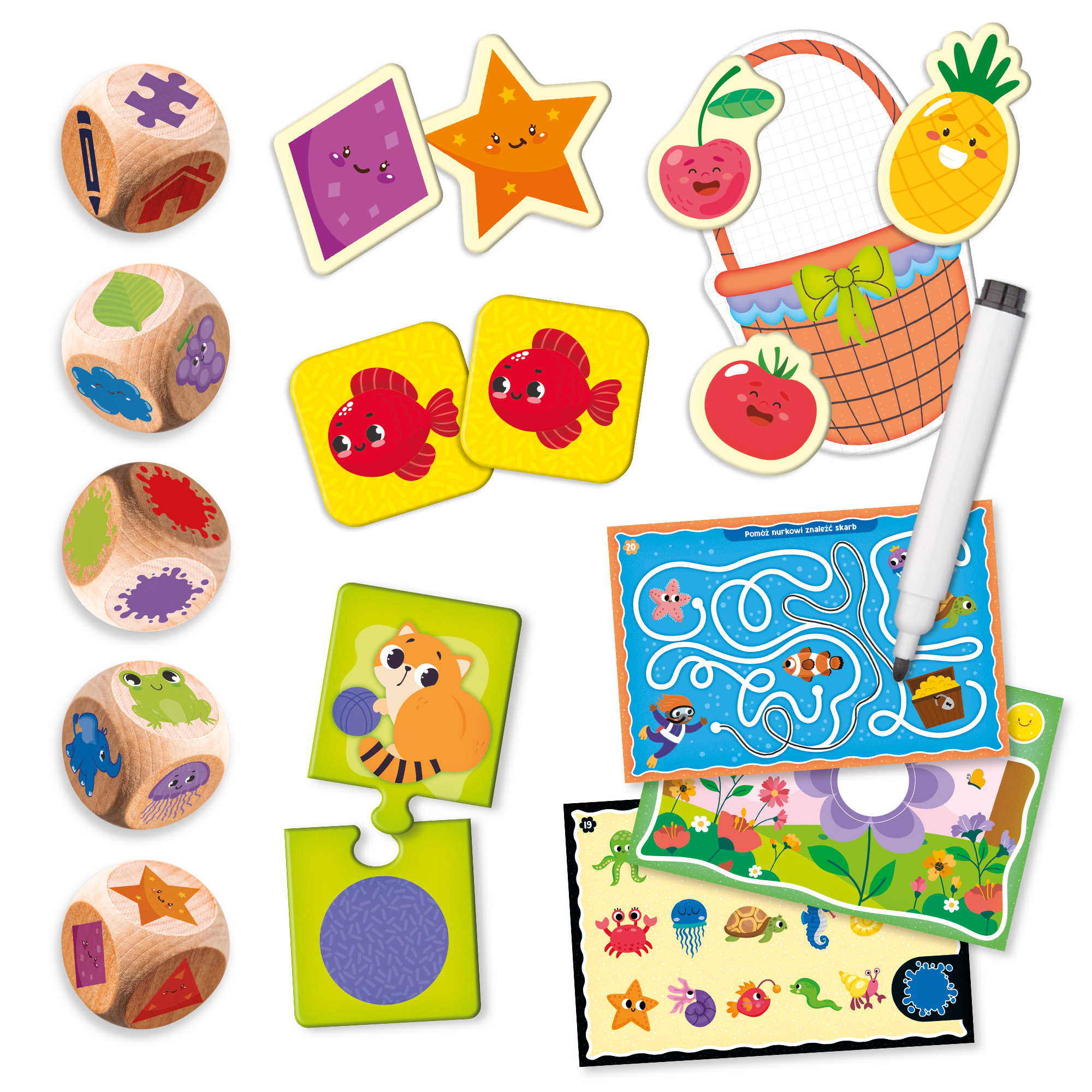 Seria zabawnych i edukacyjnych aktywności dla dzieci w wieku przedszkolnym. Pięć kostek, dzięki którym dzieci będą się świetnie bawić, a jednocześnie uczyć i rozwijać wiele niezbędnych umiejętności – pamięć, logikę i uwagę.