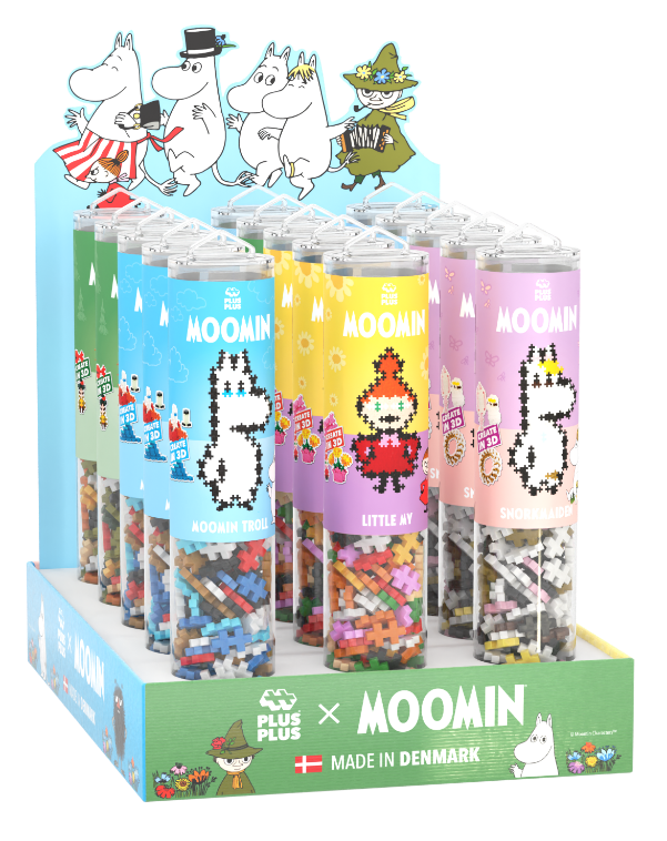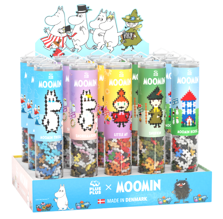 Display Plus-Plus, który świetnie nadaje się do ekspozycji w sklepie zawiera 15 tub. W skład displaya wchodzą po 3 tuby z Muminkiem, Migotką, Małą Mi, Włóczykijem i Domem Muminków.